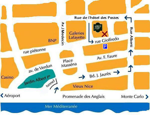 • From Aix en Provence : exit n°55 Promenade des anglais. direction Nice along the sea side. In front of the Hotel Le Méridien, turn on left direction hotel massena, turn on left on the Place Massena, in front of the Mall "Les Galerie Lafayette, turn on right
