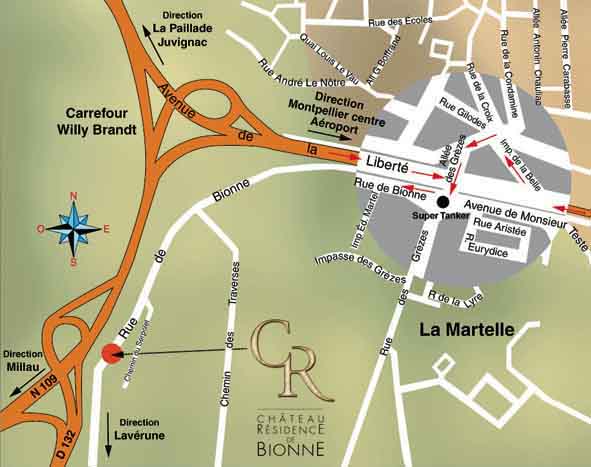 From Montpellier centre : Follow the direction « Millau ». When you are on the road « Avenue de la Liberté », after the sign « SOMEDI », take to the right, direction « la Martelle ». On the STOP, turn to the left. At the traffic light, cross the road « Avenue de la Liberté », once you crossed the road, turn immediately to the right when you are next to the shop « LIDL.