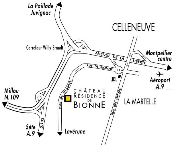 From Millau : when you arrive in Montpellier, follow the direction Monptellier Centre – Aéroport de Fréjorgues. At the first traffic light (the shop « LIDL » is on your right hand), take to the right while turning the hairpin to take to the right. At the stop, take « la rue de Bionne » in front of you. You leave Montpellier. After 800 m you will find the « Château Résidence de Bionne ».