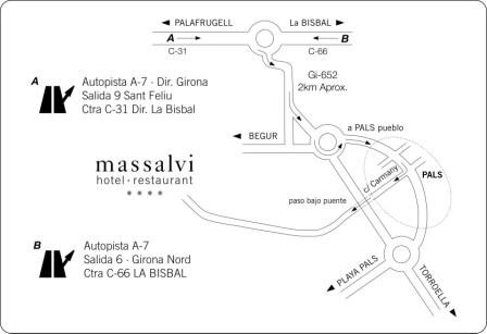 • Highway A-7 from Barcelona to France. Get out in the exit number 6 and take direction to La Bisbal. Once past this population remain straight and in a round about you will find the indication to Pals. Once in Pals nter inside the town to see the indications to the hotel Mas Salvi.