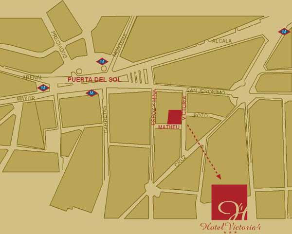 • How to get to the hotel?. Victoria 4 is located in the city centre of Madrid, within walking distance to the most emblematic locations, museums, theatres, cinemas, restaurants, bars, shopping centres... By underground: SOL (Lines 1, 2 & 3) By bus: 5, 15, 20, 50, 51, 52, 53, 150. Please phone our reception team if you need further assistance with hotel directions.