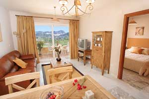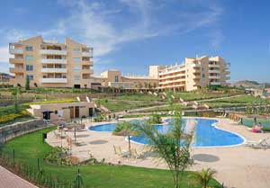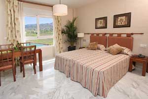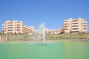 Situated in the beautiful Guadalhorce valey, near the village Alhaurin de la Torre and 5 min. away from de Lauro Golf, 10 min. from the airport and 15 min. from the beaches of the Costa del Sol. We offer 100 studios, 1 bedroom and 2 bedroom appartments. The appartmentsare equiped with TV, music channels, airconditioning/ heating, fully equiped bath room, kitchen with fridge, washing machine, dishwasher, microwave and amplious balcony. The hotel has about 130.000m2 of gardens with an outdoor swimming pool and a lake in the middle. The hotel offers an international restaurant, piano bar, tapasbar, theatre, library, business centre, supermarket. Apart from this we offer you 1000m2 Spa centre, fitness centre, indoor swimming pool with sauna and jacuzzi.