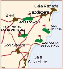 Way instruction to the Petit Hotel Leaving the airport you have to take the road direction Santanyí, not to city centre “centro ciudad”. Leave the road when you see the sign “Manacor” and follow always direction to Manacor. You will pass by Casa Blanca,Algaida, Montuiri, Villafranca, Manacor. When you come to Manacor please follow direction San Lorenzo and Son Servera. In San Lorenzo you have to take the road to SON SERVERA. When you come to Son Servera you have to take direction CAPDEPERA (or CALA RATJADA). After 3 km leaving Son Servera at the left hand you will see Pula, his restaurants, golf course and the Petit Hotell.