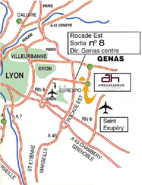 15 mn away from downtown Lyon, 10 mn away from Saint-Exupery airport and train station, 5 mn away from the exhibition center Eurexpo. How to get there : from the motorway connect to A46, then exit number 8, follow Genas Centre, Ambassadeur Hotel is directly on the roundabout. Facilities : closed private car parks (with one underground), disabled people facilities, free shuttle to and from Saint-Exupéry airport and TGV station
