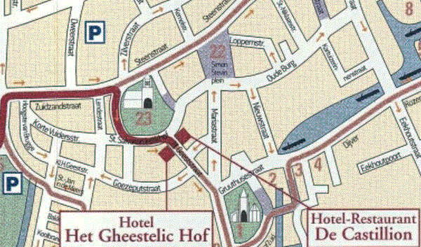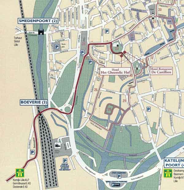 You take the E40 / A17 and near Bruges, you follow direction "Sint-Michiels". In Sint-Michiels, you take direction "Centrum" (centre), and you will arrive next to the railwaystation of Bruges (see map). At the roundabout, you turn to the left and drive straight ahead, direction " 't Zand". At 't Zand, a big square with a large fountain in the middle, you take the second street at your righthand side, the Zuidzandstraat (our shoppingstreet). Halfway this street, just before the cathedral St-Salvator, you turn to the right. Follow this street to the left and you see already our hotel. Good luck !
