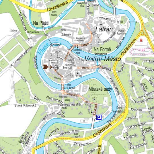 Getting to us... Arriving from Ceské Budìjovice direction: at first traffic lights turn left to cross the river Vltava, at next traffic lights turn right to Horní street. After you get to the square, go down and turn left, the hotel is a corner building about twenty metres from the square. Arriving from Vyšší Brod and Rožmberk direction: turn left after you pass the first Èeský Krumlov bridge, after you pass another bridge there is the hotel parking lot P3. Keep going from the parking lot passing along Linecká street until you get to the bridge of Dr. E. Beneš, having it crossed turn left to Louže. The hotel is a blue building, phone box stands next to it.