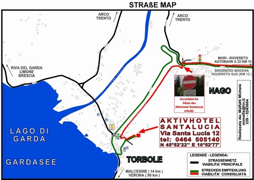Coming from A22: (Rovereto Sud-Lago di Garda Nord exit): A22 motorway Brennero-Modena, “Rovereto Sud – Lago di Garda Nord” exit, go towards Riva del Garda for around 11Km. On arrival in the first village of Nago there is a large roundabout. Go all the way around and take the third exit on the right (no entry apart from residents and guests at Aktivhotel Santalucia). Continue downwards for 1.4km and at the first crossroads take a sharp left. A further 100 m and you’ll find an enchanting place on your right “Aktivhotel Santalucia”.