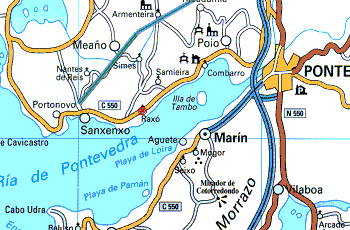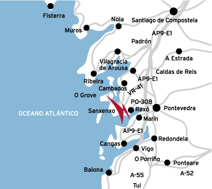 Location map. On the beach of Raxó, in the heart of Pontevedra estuary. 3 km. from Sanxenxo and 12 from Pontevedra. Near by Combarro, O Grove, La Toja Island, Portonovo, Cambados, etc.