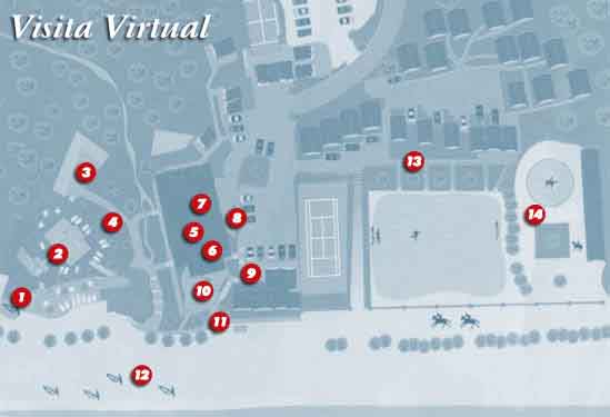 • 1= sport school 2= swimming pool 3= 4=gymnasium 5=views 6=cafeteria 7=rooms 8=entrance 9=patio 10=terrace 11=gardens 12=beach 13=bungalows 14=horses