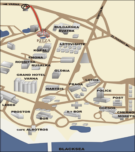 You can reach hotel "Ritza" by bus ¹ 409 from the airport. You have to follow the direction "Golden sands" till "Marek" busstop. Travelling time by bus takes 40 minutes. You can take bus ¹ 409 as well as you travelling from bus station (direction "Golden sands", "Marek" busstop). Travelling time is 30 minutes. Bus ¹ 39 goes from railway station to hotel. Please, also follow the direction "Golden sands" till "Marek" busstop. Travelling time is 30 minutes.