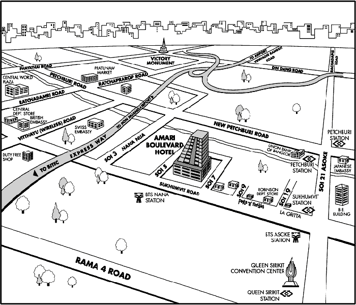 • Filled with everything from luxury shopping malls to colourful food hawkers to executive office buildings, Sukhumvit Road is the true heart of downtown Bangkok. Just a short walk from the both the Nana Skytrain station and the Sukhumvit underground station, in one of the most dynamic and active regions of the city, Amari Boulevard is well connected to the pulse of the vibrant Thai capital city. The hotel is located in easy reach of Suvarnabhumi International Airport, the shopping area of Siam Square and the primary Bangkok tourist landmarks. Whether you are visiting Bangkok to attend to business, to see the sites or to experience Southeast’s Asia’s most dynamic capital city, you couldn’t be closer to the action.